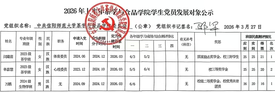根据《中国共产党发展党员工作细则》(中办发[2014]33号)、《信阳师范澳门威尼斯人娱乐城 发展党员工作实施细则》(信院组发[2018]19号)等文件要求,经资格审查(根据本人上报成绩,结合教务系统导出成绩排名和班级提供的综合测评情况)、民主评议、党委研究讨论,拟确定闫璐苗、单嘉慧、万鹏3人为澳门威尼斯人娱乐城 2026年上半年党员发展对象,现将名单予以公示,公示期为5天。