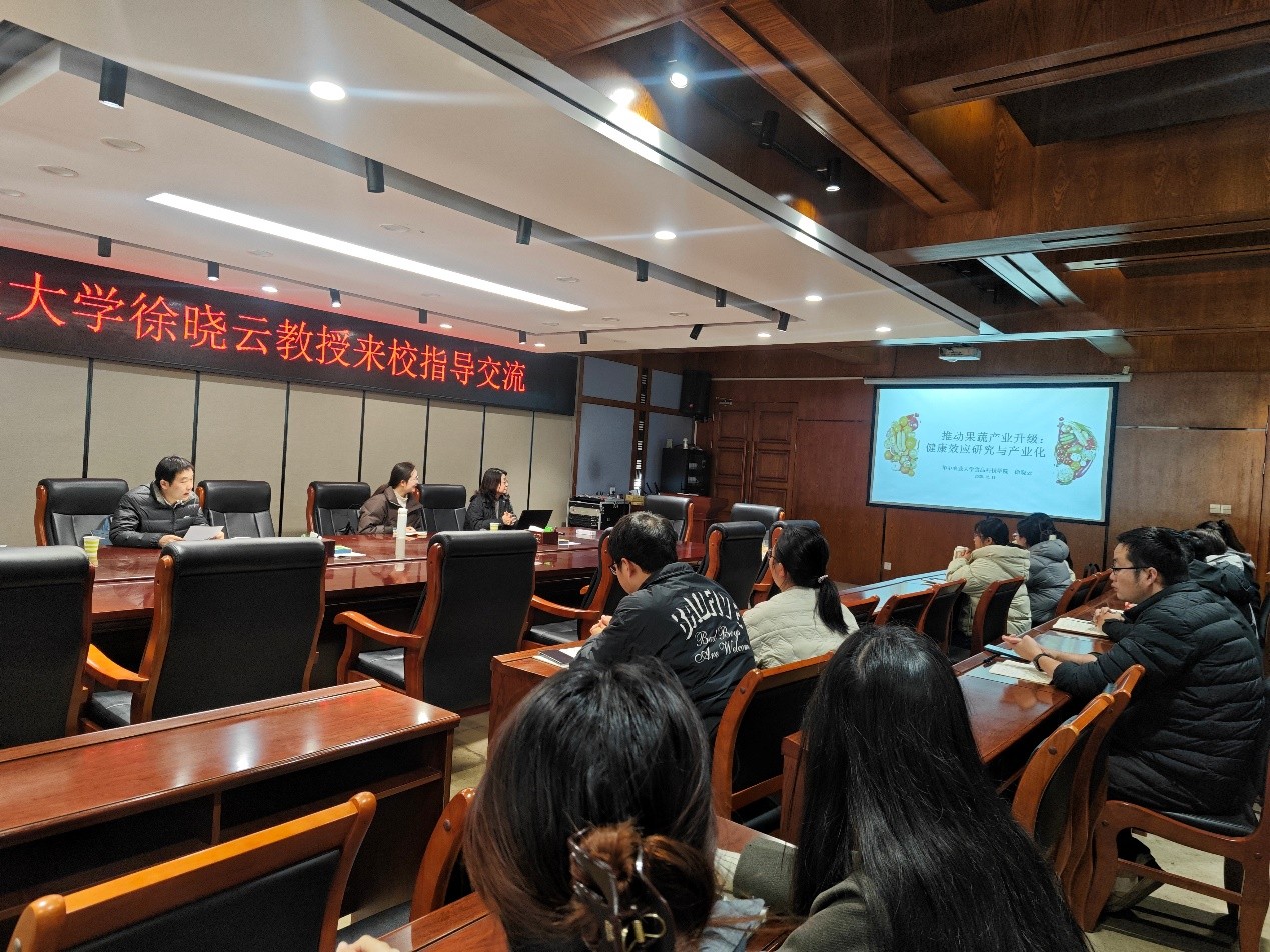 12月11日上午,华中农业大学徐晓云教授受邀在逸夫楼321会议室,为澳门威尼斯人娱乐城官方网站 师生作了题为“推动果蔬产业升级:健康效应研究与高值化技术开发”的专题学术讲座。澳门威尼斯人娱乐城 院长周棋赢教授主持讲座,50余名师生代表现场聆听。