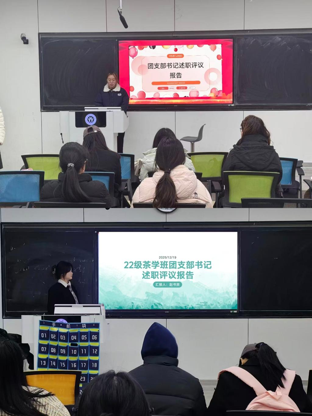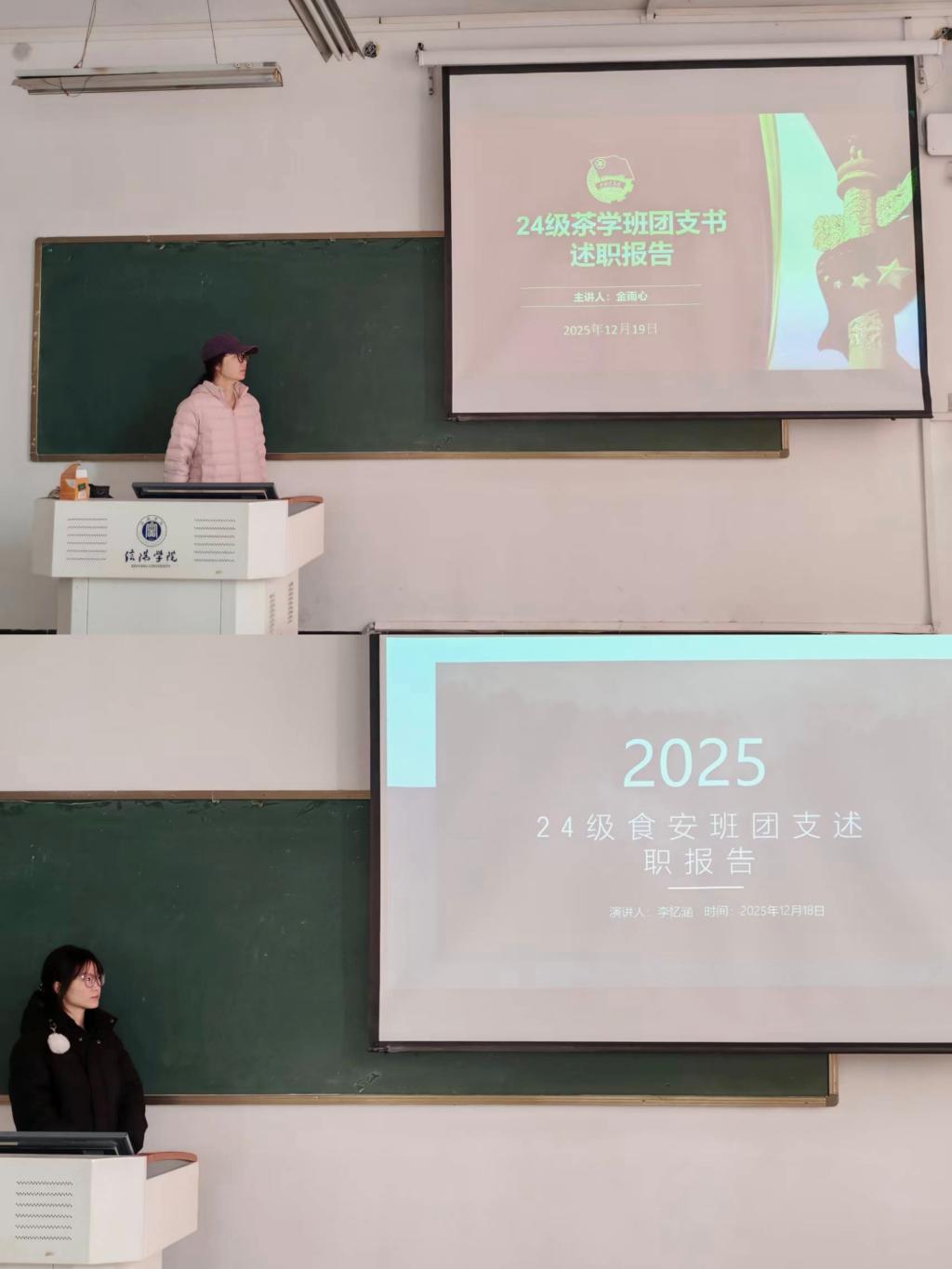 在述职汇报环节,各团支部书记结合本支部特点进行了差异化阐述。2022级茶学班团支书赵书贤重点汇报了高年级支部在思想引领与组织建设中形成的系统性工作经验,展示了支部在推动理论学习和实践结合方面的成熟做法,为低年级支部建设提供了有益参照。2023级茶学班团支书宿珈萌系统梳理了过去一年支部在组织建设与思想引领方面取得的实质性进展,重点展示了主题团日活动规范化、团员发展程序标准化等工作成效,体现出对基层团务工作的深入理解。2024级茶学班团支书金雨心着重汇报了创新性活动的组织开展情况,特别是在结合专业特色开展劳动教育、文化传承等活动中形成的特色做法,并对活动组织过程中发现的问题进行了深入剖析。2024级食品质量与安全班团支书李忆涵通过具体案例和数据,详细呈现了支部在促进学风建设、开展社会实践等方面取得的突出成果,同时客观分析了工作中遇到的挑战与应对经验。2025级新生团支部书记胡宇晗、黄杰分别展示了支部基础建设成果。胡宇晗重点介绍了团支部与班委协同工作机制的建设情况,黄杰则汇报了结合专业特色开展的首批主题团日活动,展现了新生团干部的积极履职状态。各支部述职内容既体现了工作成果与特色,也包含了问题反思与经验总结,较为全面地反映了基层团组织建设的不同侧面与发展阶段,展现出团干部队伍的多元成长路径。