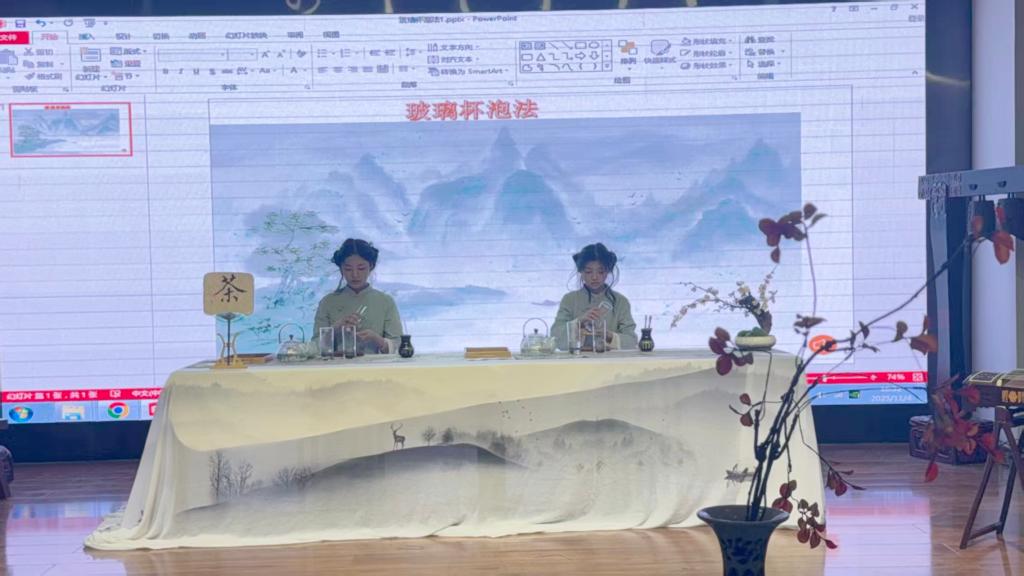活动伊始,李庆会博士以亲切的自我介绍拉近了与学生的距离。随后,她以生动幽默的语言,从泡茶的温度这一关键要素切入,系统讲解了绿茶、普洱茶、乌龙茶等常见茶类的适宜水温、茶水比例及冲泡技巧,使同学们对茶叶冲泡的科学性与艺术性形成了清晰认识。在此基础上,李博士进一步围绕茶礼仪的核心内涵展开阐述,精妙解读了“礼者,敬人也”这一基本理念,深刻揭示了茶文化中蕴含的尊重、谦和与自省的人文精神,为同学们构建起一个兼具理论深度与实践意义的茶礼仪认知框架。紧接着,茶艺表演环节将现场氛围推向高潮。现场依次呈现了三套独具特色的冲泡技艺:在玻璃杯冲泡展示中,2024级茶学班王佳宇与刘晓亚同学运用“下投法”,素手轻扬,以“凤凰三点头”的经典手法注水三巡,水流如瀑,既充分激荡茶叶,亦传递出对来宾的深深敬意。嫩叶在杯中舒展沉浮,宛若碧波起舞,生动诠释了绿茶特有的“茶舞”之美。在盖碗冲泡环节,2023级茶学班张琪与魏晴同学手法精准娴熟,通过调节盖隙巧妙控制水温,不仅展现了盖碗集容纳、冲泡、品鉴于一体的实用价值,更传递出“三才碗”所蕴含的天、地、人三才和合的哲学意境。